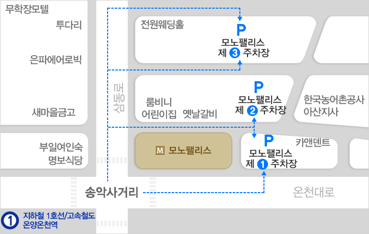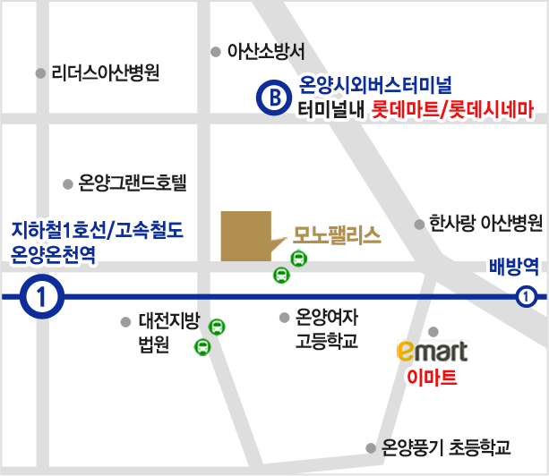 지하철 1호선 온양온천역 하차 (1번출구)후 도보 7분 거리